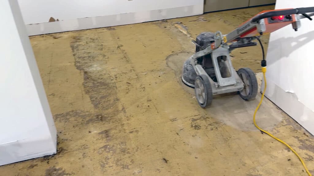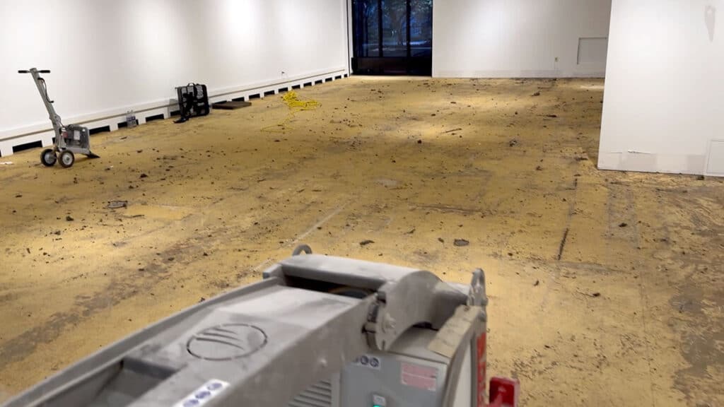 Before jumping in, we inspected the flooring to locate seams, transitions, and areas with excessive adhesive buildup. We identified multiple layers of old carpet glue that had penetrated the concrete and couldn’t be removed by simple scraping.
