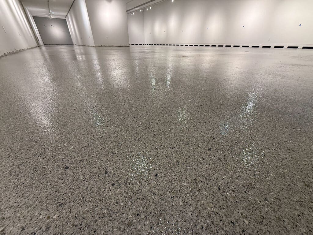 After allowing for the proper curing time, we removed the excess flakes and applied a polyaspartic top coat. This top coat provides abrasion and chemical resistance, extending the life of the flooring system.